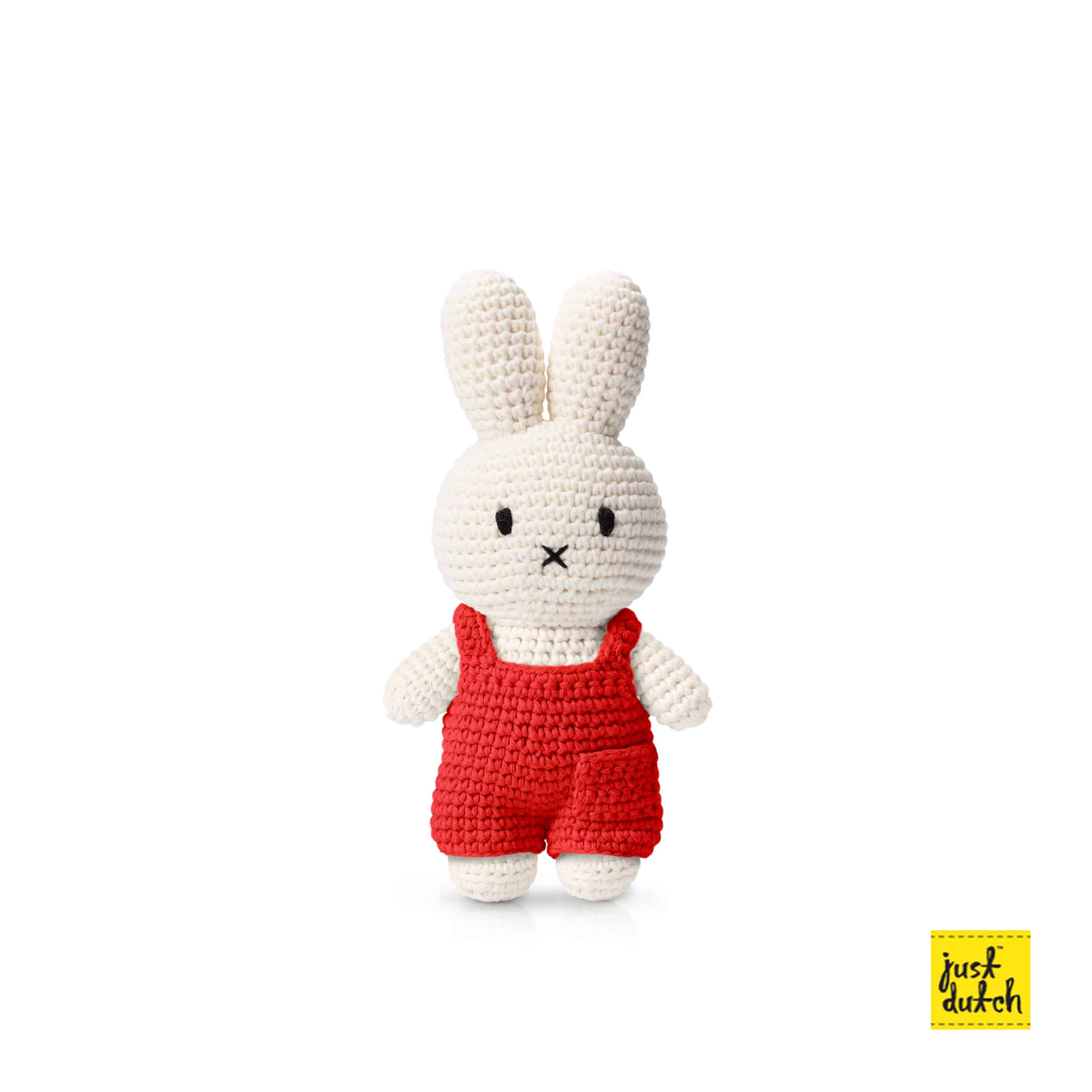 Just Dutch Miffy Handmade Crocheted Soft Toy In Red Overall Fabric: 100% cotton. Machine wash at 30°C/ Hand-wash is advisable. Product size: 10x8x3 inches / 25x20x7 cm.